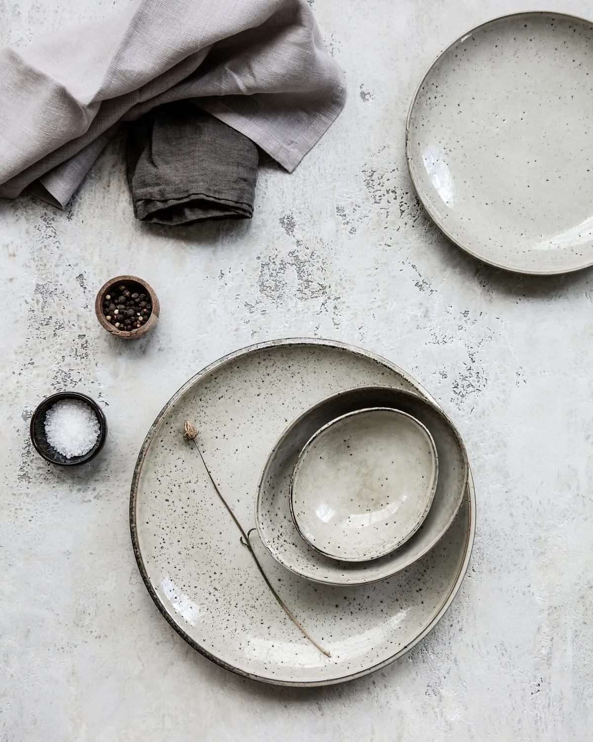 Monta una mesa rústica y desenfadada con el plato Lake en gris de la marca House Doctor. El plato está hecho de cerámica y tiene un hermoso esmalte grisáceo, con pequeños lunares marrones irregulares y un borde decorativo. ¡Está disponible en diferentes tamaños y es ideal para todo tipo de ocasiones!